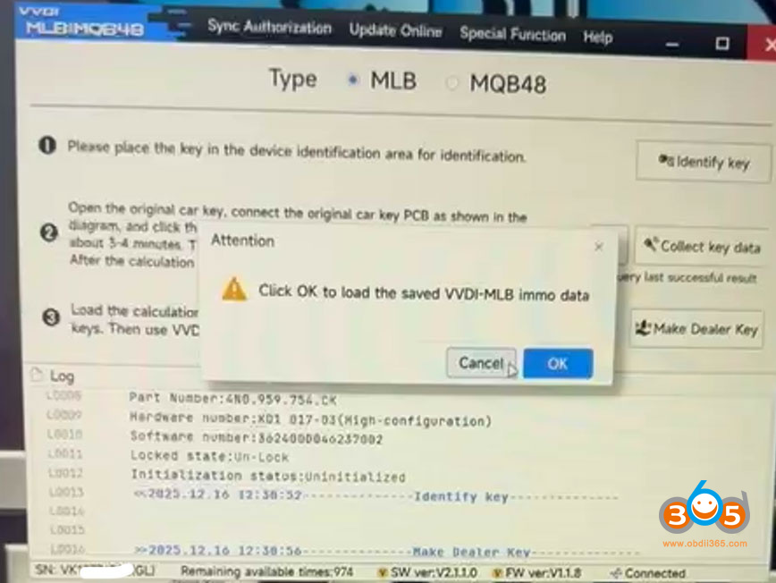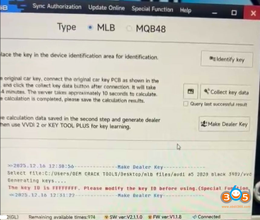 VVDI MLB tool collected data ok, but failed to generate the dealer key. ID all FF.