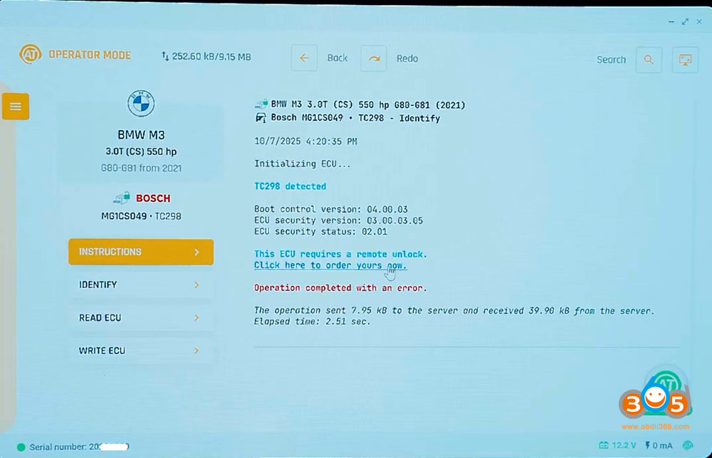 A message will confirm whether: the ECU is supported, the ECU is already unlocked, remote unlock is available. - Remove the ECU and check its general condition (pins, casing, etc.).