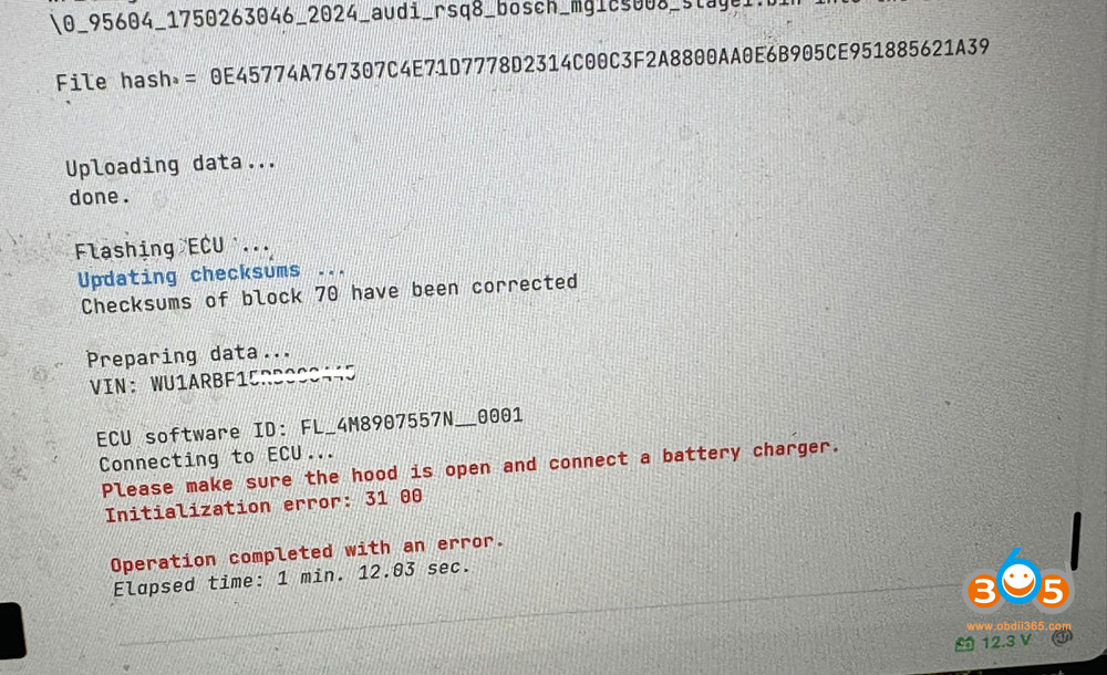 Tried to read 2024 Audi RSQ8 Bosch MG1CS008 ECU with Autotuner via OBD VR, hood is up with charger. But software still asks to open hood and conect charger. Any idea?