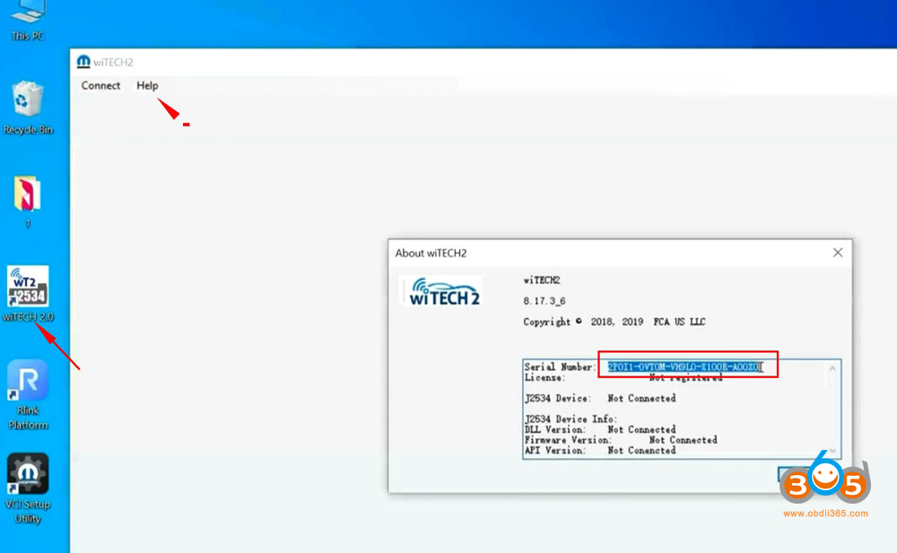 Open the newly installed Witech2.0 software, select Help, and copy the Serial Number of your computer.