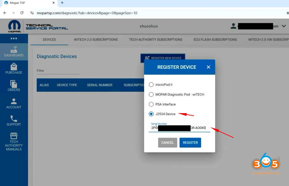 Select J2534 Device, enter the copied computer serial number and click REGISTER to complete the binding between Witech2.0 software and computer.
