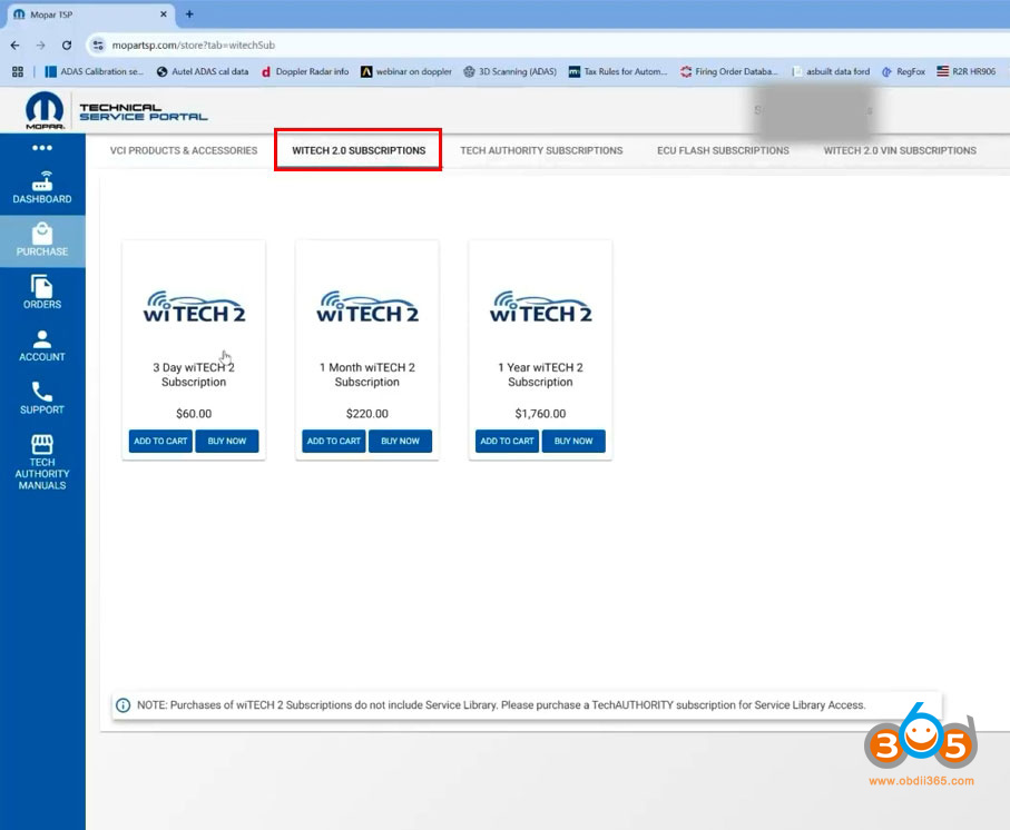 Click PURCHASE and select WITECH 2.0 SUBSCRIPTIONS to select the plan you want to subscribe to.