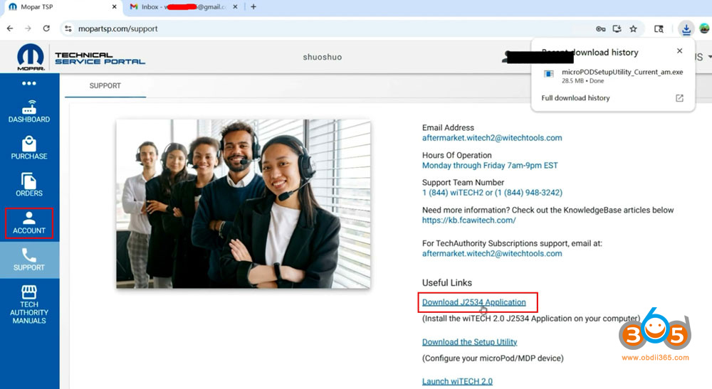 After the completion of the filling, click SUPPORT and select Download J2534 Application to enter the software download page.