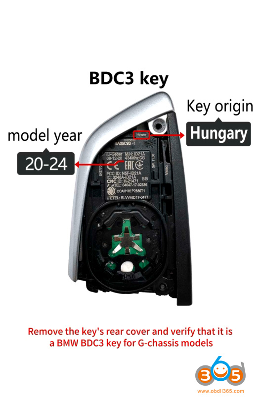 Remove the key’s rear cover and verify that it is a BMW BDC3 key for G chassis manufactured between 2020 and 2024 in Hungary.