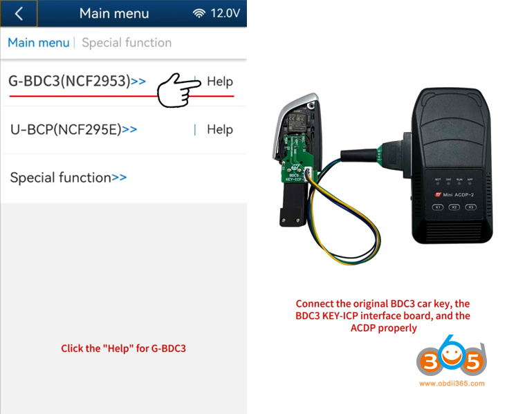 Connect the original BDC3 car key, the BDC3 ICP interface board and ACDP properly.
