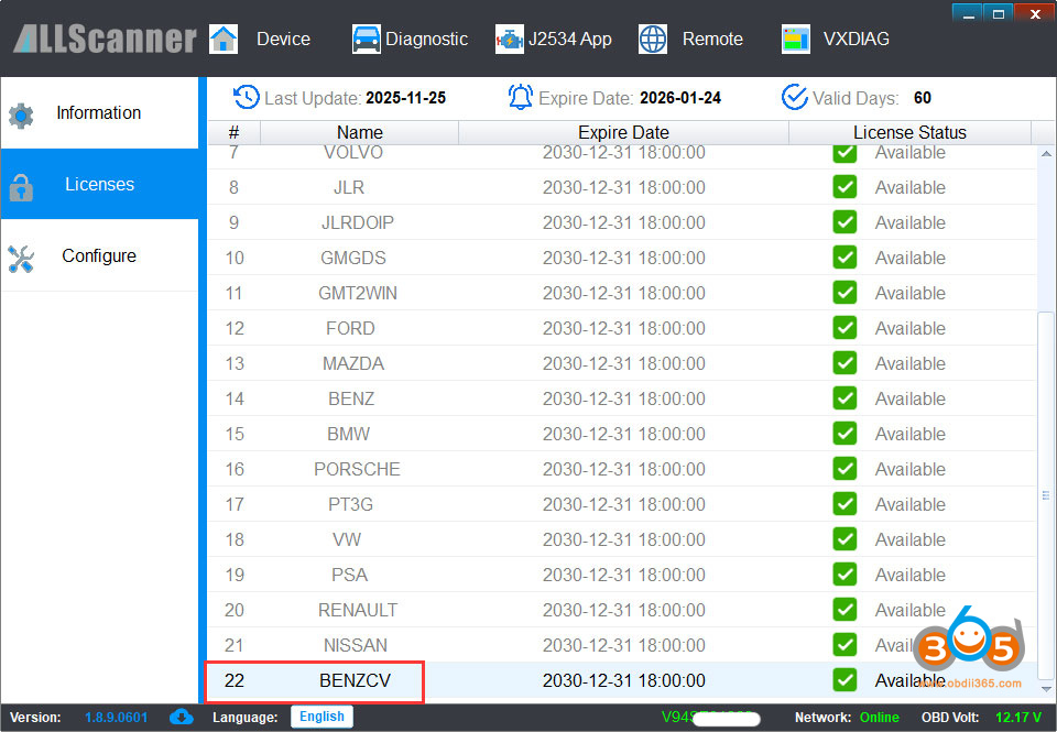 2. Update VCI License: Activate and confirm your BENZCV license is present and active.