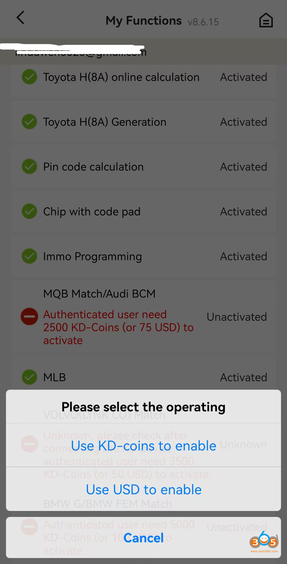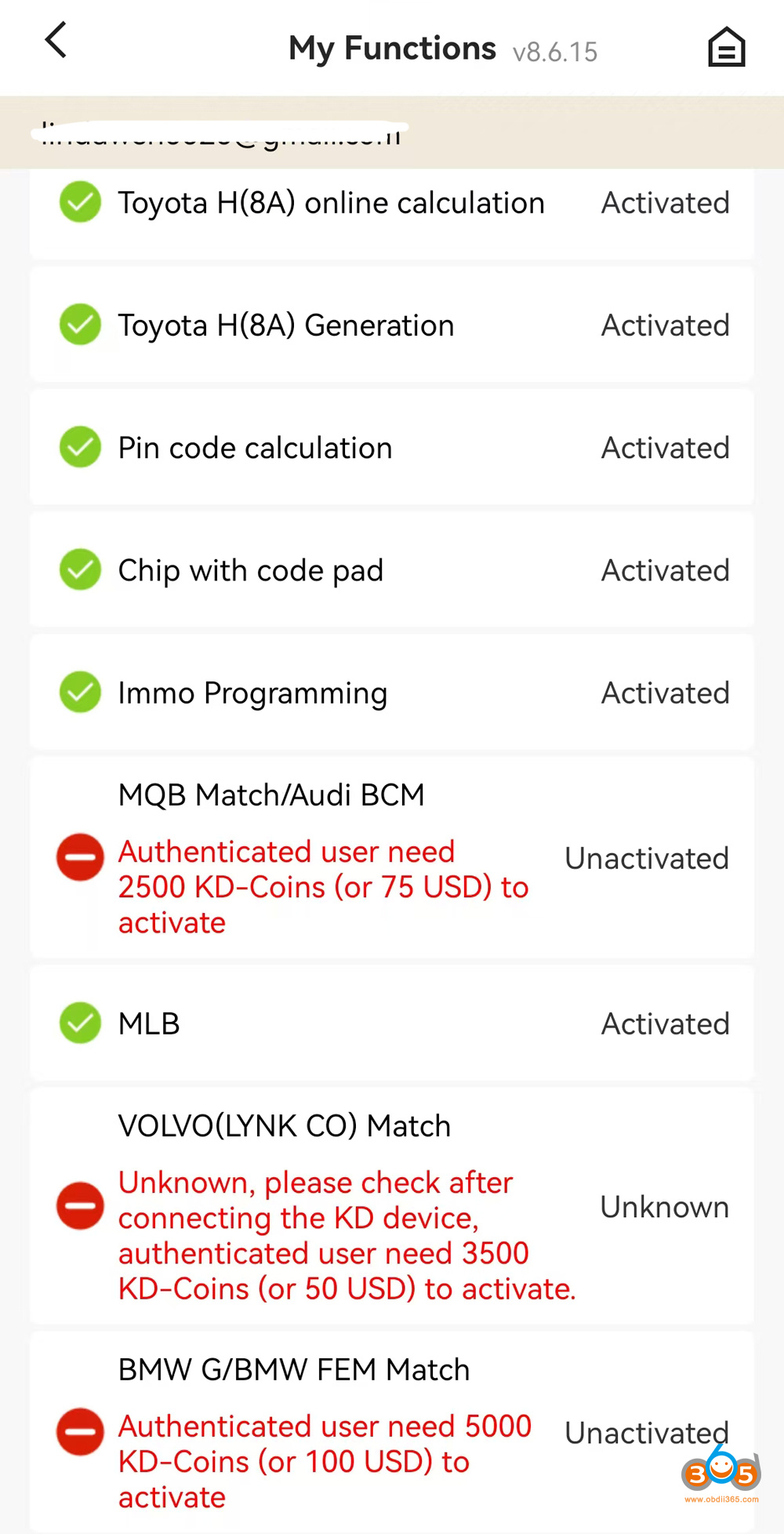 Licenses are shared across KD devices within a single KD account. For instance, once the MQB function is activated on the account, it becomes available for compatible devices like the KD-X2 and KD-MAX without requiring individual authorizations.