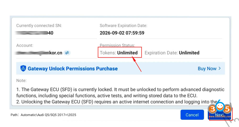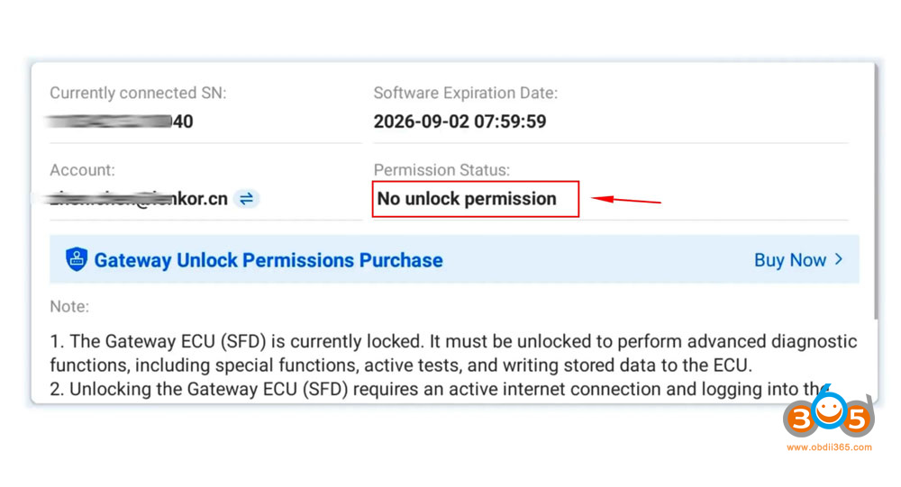 When diagnosing a VAG vehicle equipped with SFD SGW, the system will display your current unlock permission status.