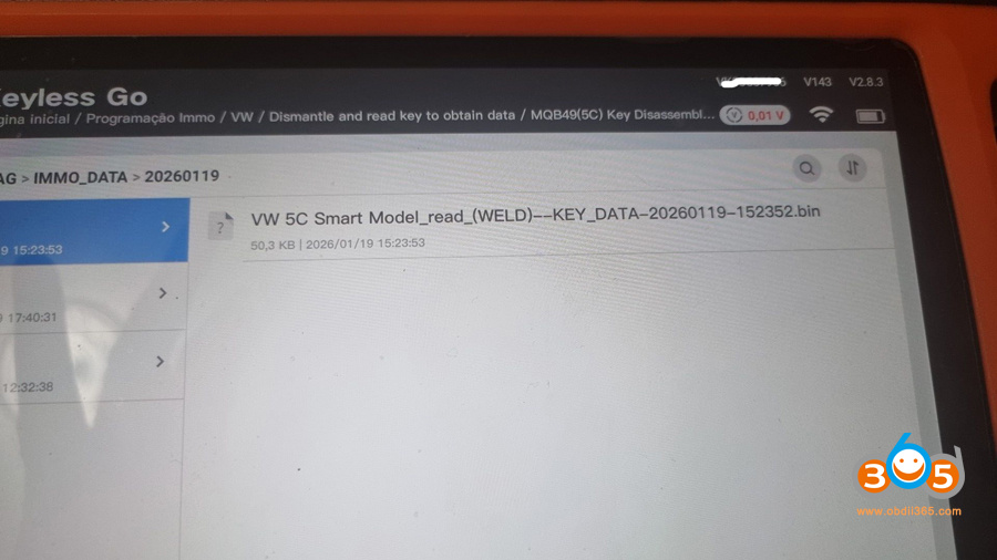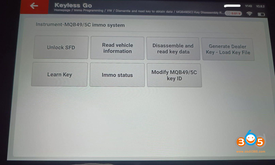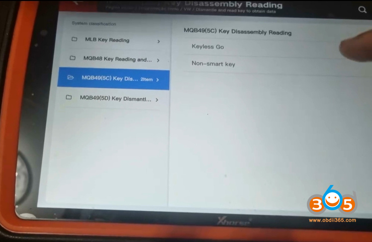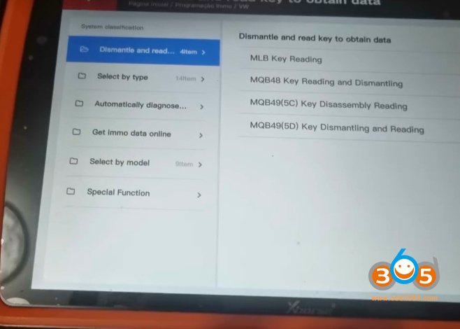 Go to IMMO Programming- VW- Select by type- MQB instrument- Read key to obtain data – MQB49 (5C) key disassembly reading or MQB49 (5D) key dismantling and reading.