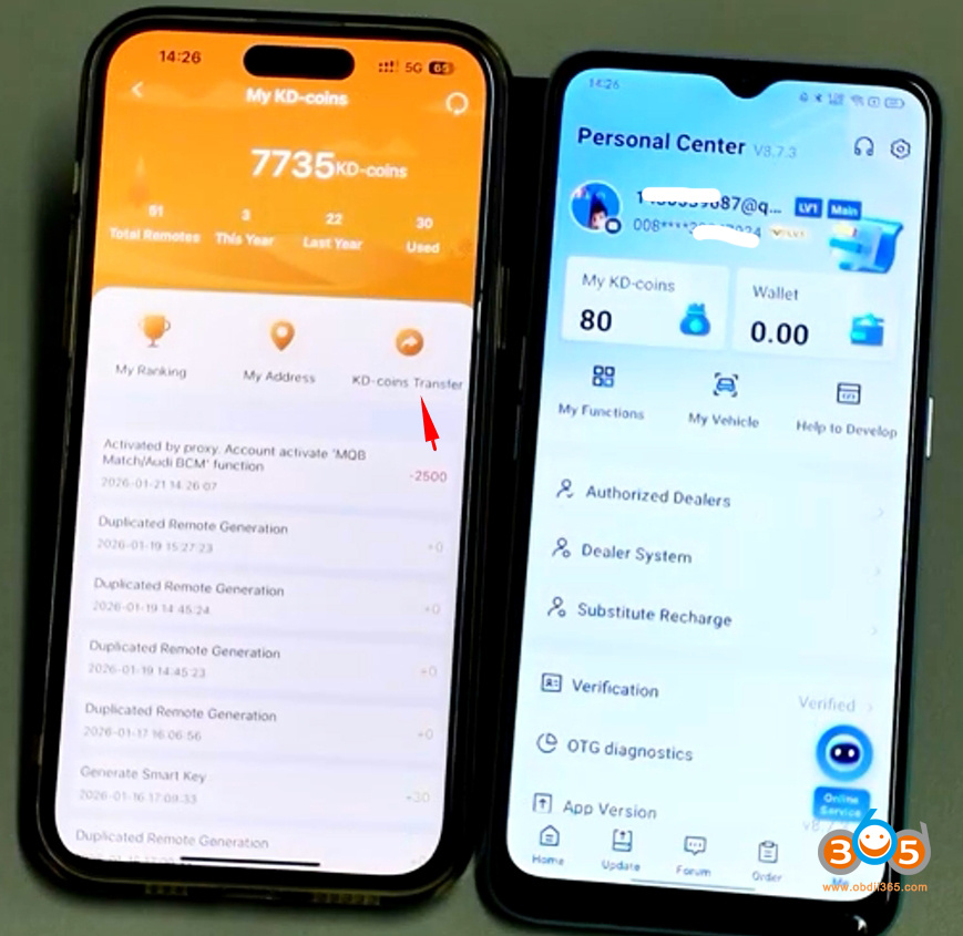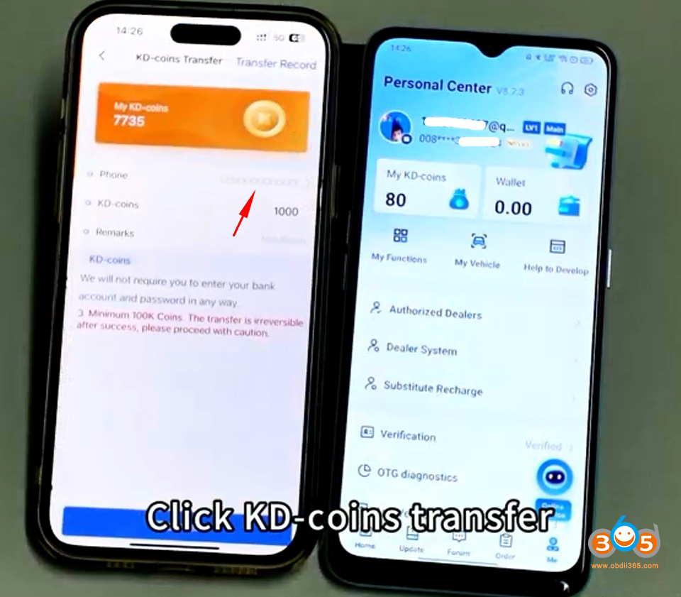 In user A’s app, go to My KD Coins- KD coins Transfer.