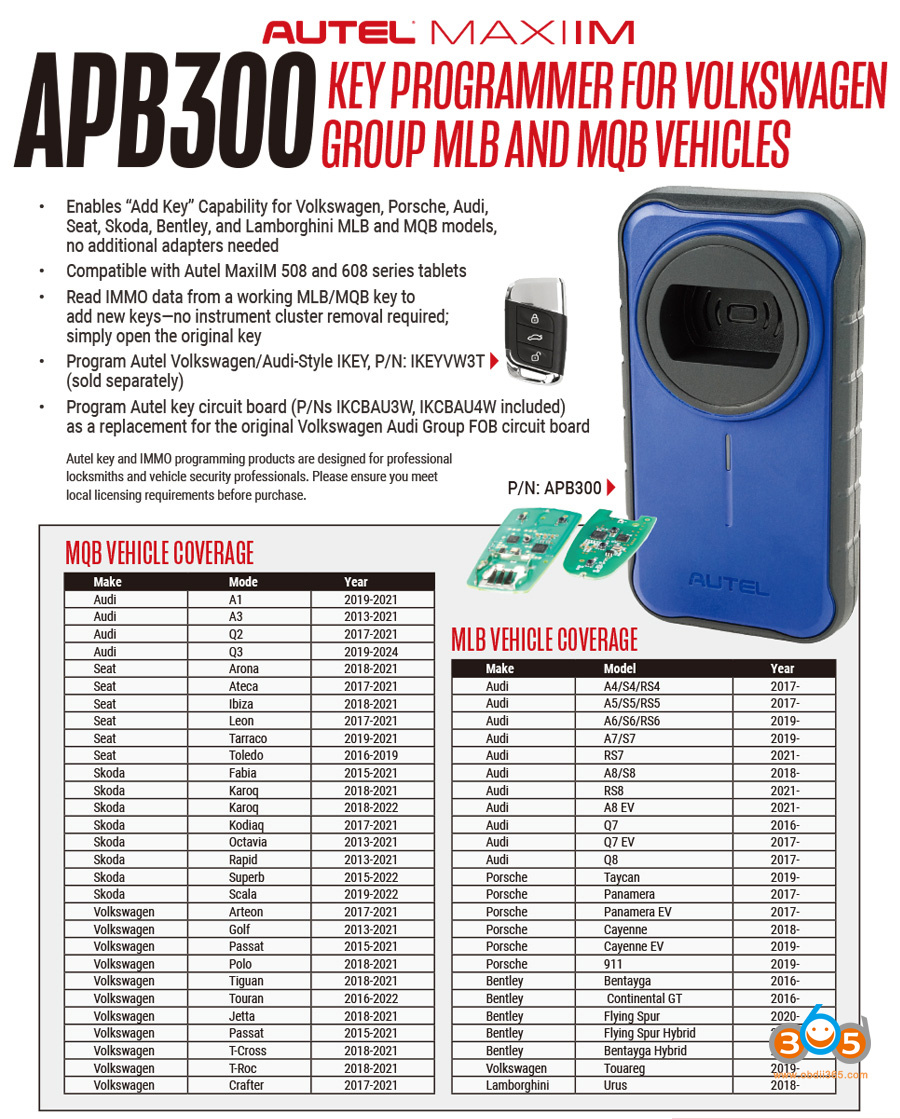 Enables “Add Key” Capability for Volkswagen, Porsche, Audi, Seat, Skoda, Bentley, and Lamborghini MLB and MQB models.