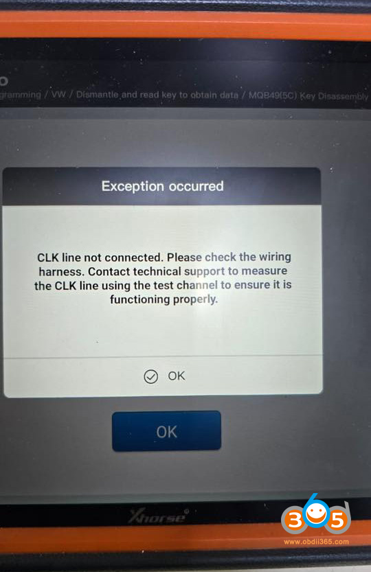 Tried to add a 2023 VW MQB49 5C key with Xhorse VVDI Key Tool Plus. It failed to read original key data. It says error CLK not connected.