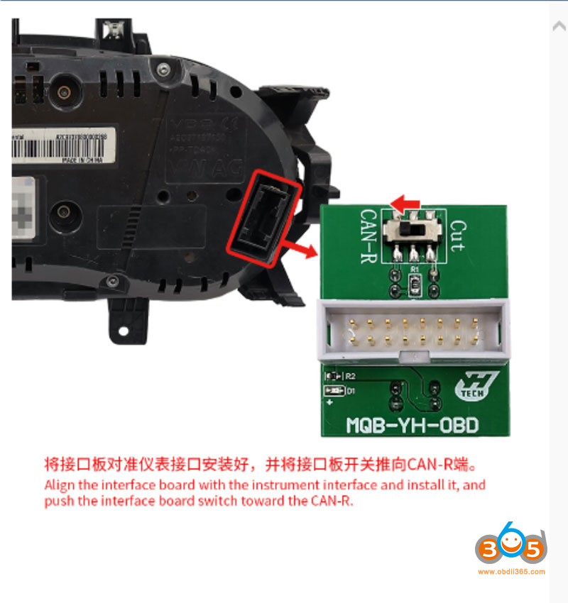 Align the MQB YH-OBD interface board with the instrument interface and install it, and push the interface board switch towards the CAN-R.